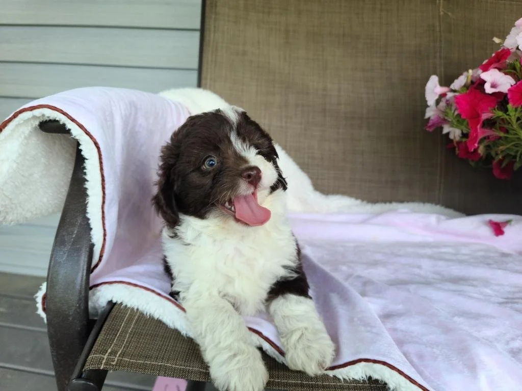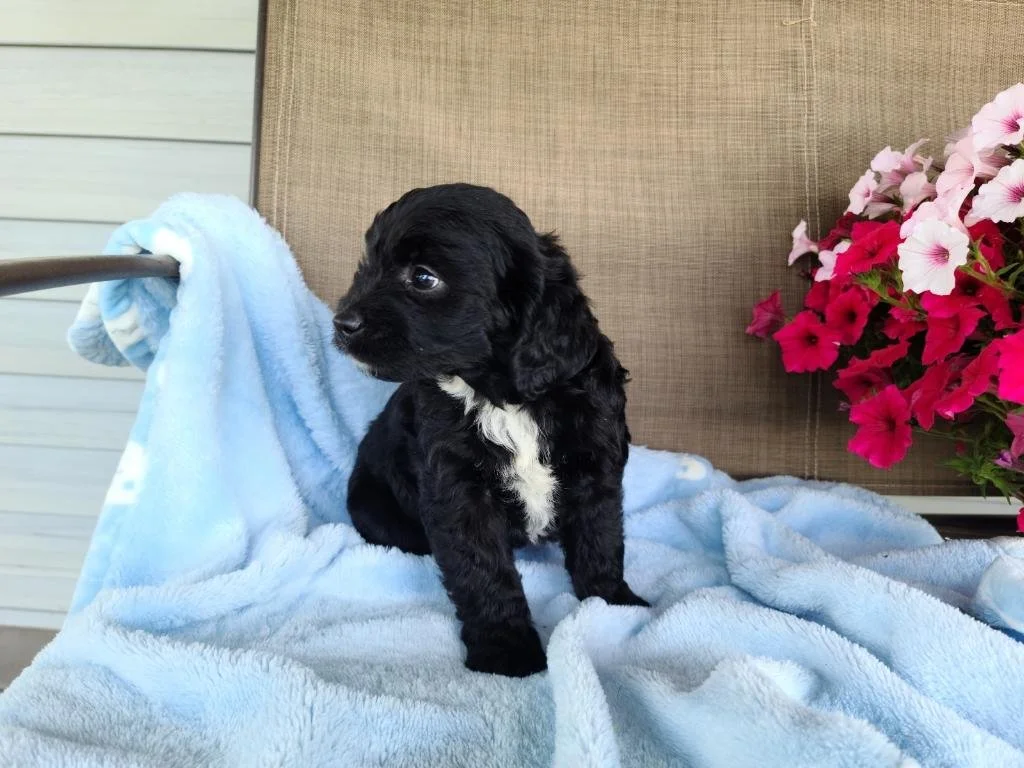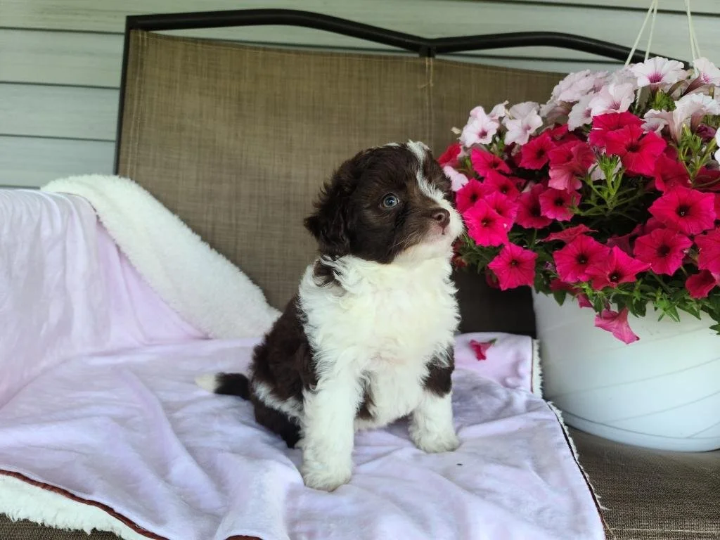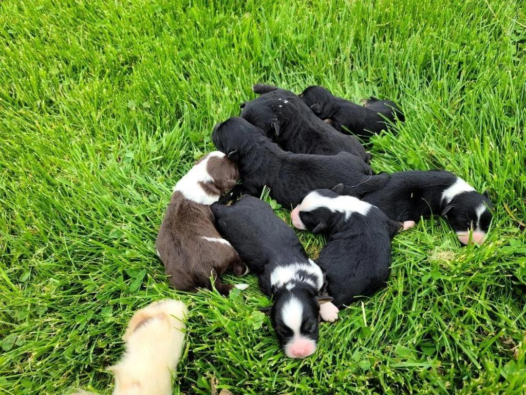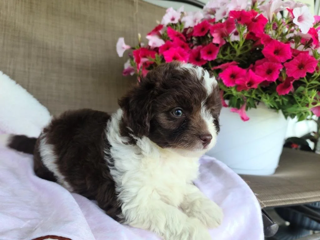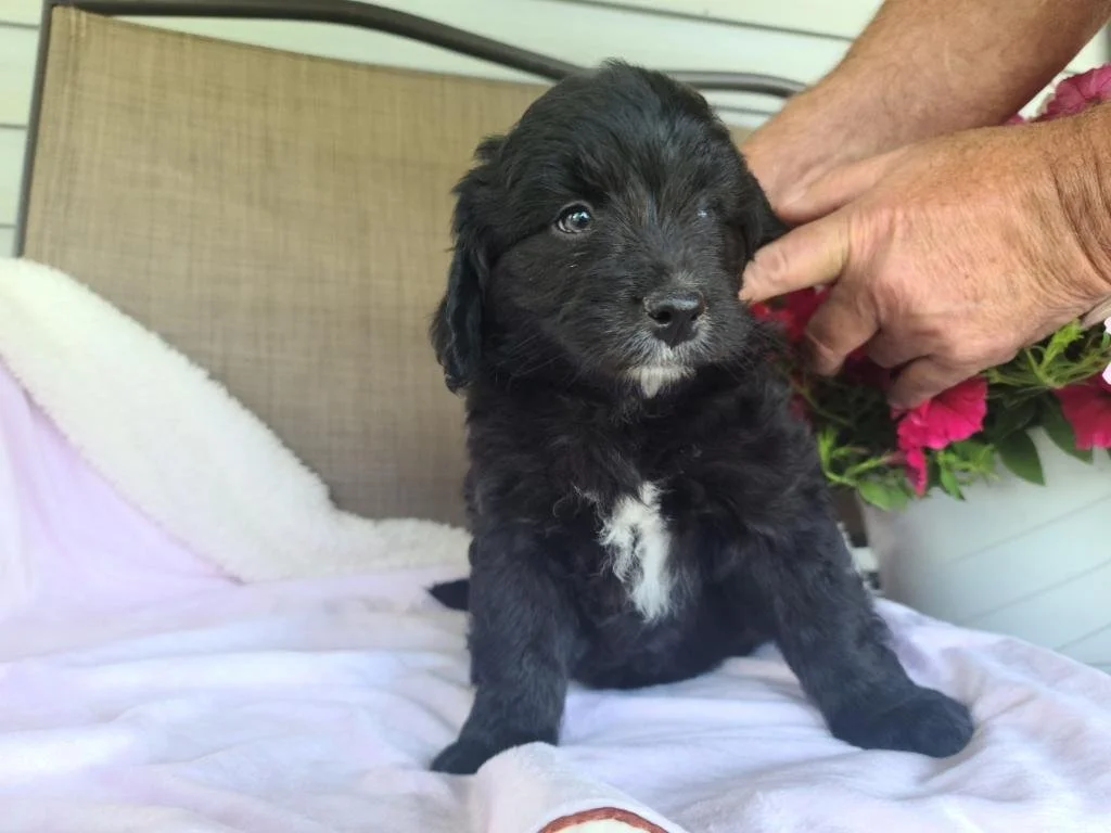 Beautiful toy Aussiedoodles that should weigh around 12 lbs. Quite a selection of colors in this litter - there are phantoms, black tuxedos, chocolate tuxedo, black, and black party. One pup has a merle collar!!