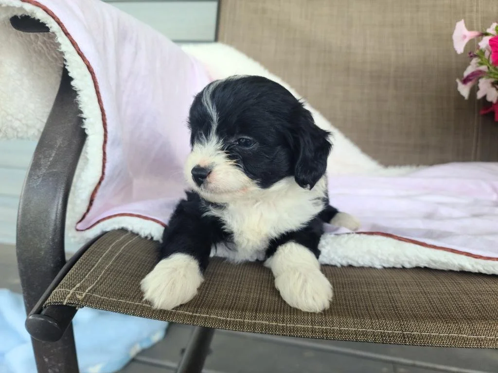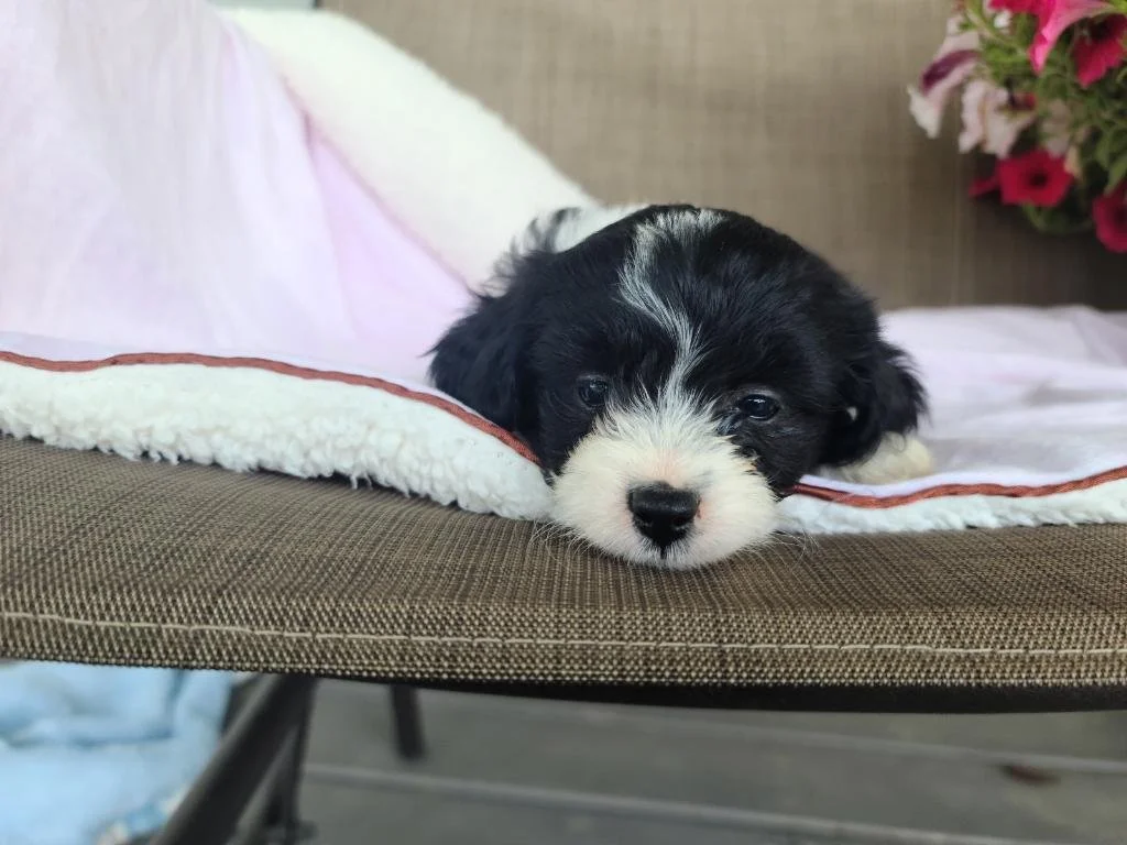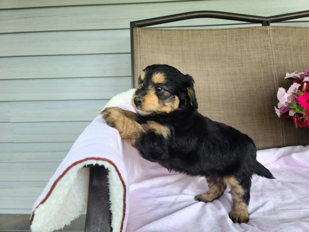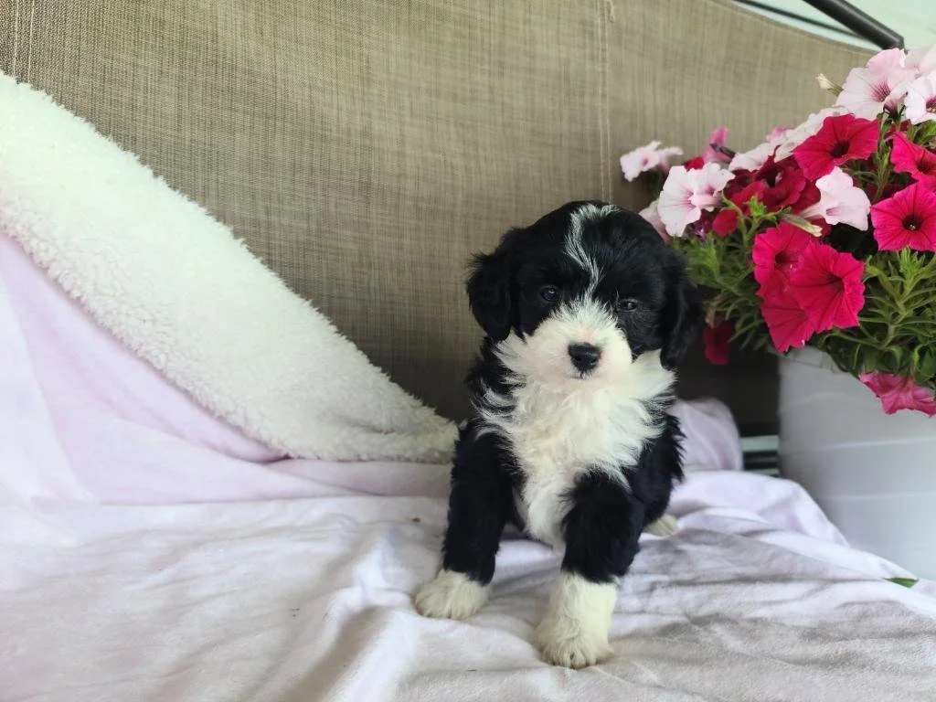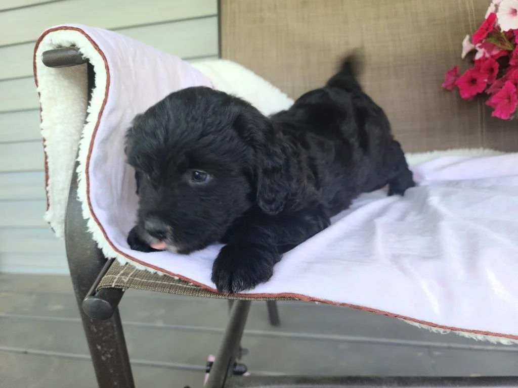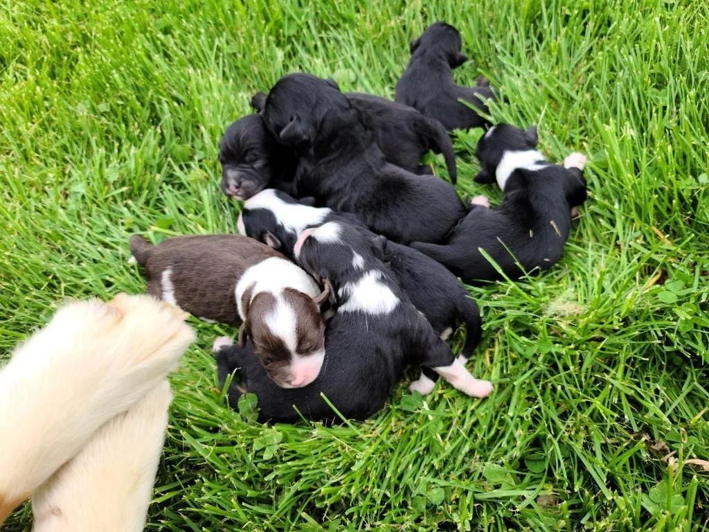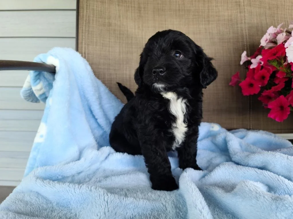Beautiful toy Aussiedoodles that should weigh around 12 lbs. Quite a selection of colors in this litter - there are phantoms, black tuxedos, chocolate tuxedo, black, and black party. One pup has a merle collar!!