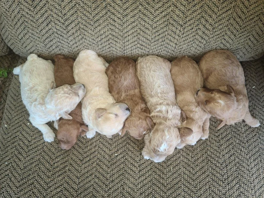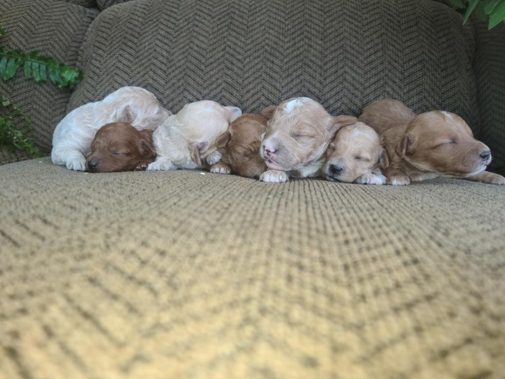 Gorgeous Litter of 7 cream, apricot and red toy poodles. These little ones should mature to about 13 lbs. Individual pictures coming when they are a little older.